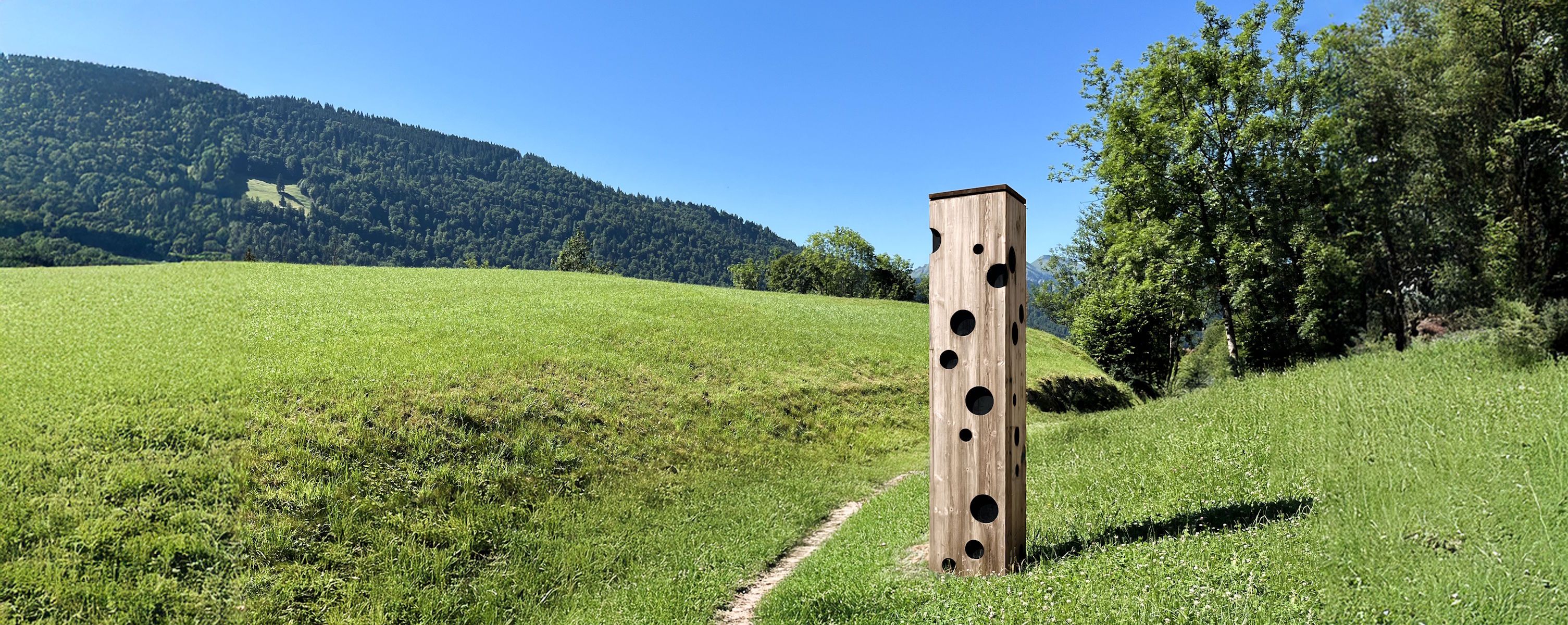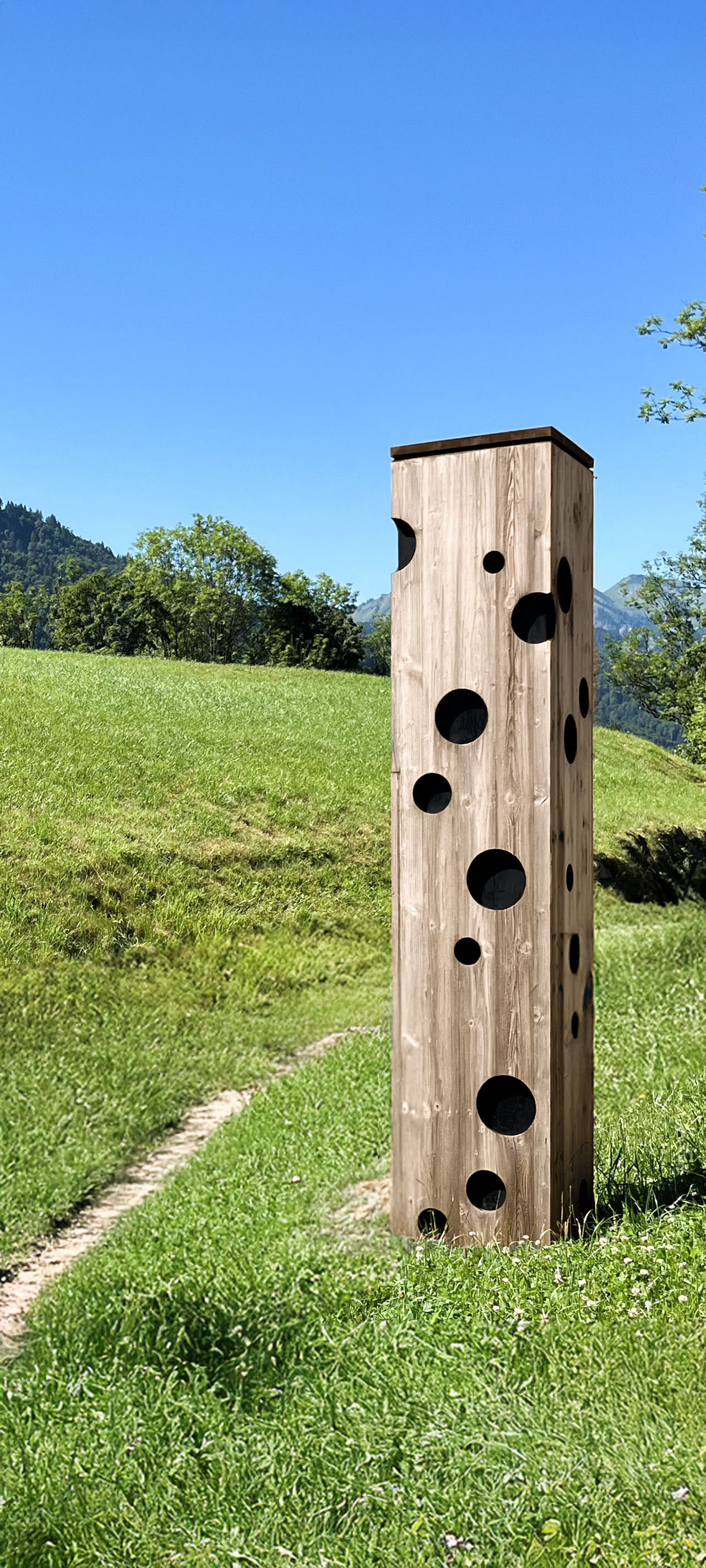 Als markanter Orientierungspunkt in der alpinen Landschaft erhebt sich der Alpenturm, welcher der Direktvermarktung von Käse und lokalen Produkten dient. Als architektonischer Markstein fügt sich dieser Turm harmonisch in die natürliche Umgebung ein, während seine schlanke, turmartige Struktur dynamisch gen Himmel strebt und so die Erhabenheit der umliegenden Berge widerspiegelt. Das Holz, legt sich einem Mantel gleich, um den kostbaren Käse und bewahrt ihn vor den rauen Bedingungen der Bergwelt. Gleichzeitig erlaubt die raffinierte Gestaltung, dass die Essenz des Turms und seine Funktion in die umgebende Natur ausstrahlt. Er wird dadurch zu einem sichtbaren Zeichen, das die enge Verbindung von Natur und Handwerkskunst betont und symbolisiert das handwerkliche Geschick der SennerInnen und Zimmerleute.